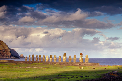 Easter Island is one of the most isolated inhabited places on the planet. It sits about halfway between the Chilean coast and Tahiti and somehow many many thousands of moons ago a crew of intrepid Polynesians tested their skills and sailed into the Pacific in search of something else. What they found would later become known as the Southeastern most point of the Polynesian triangle, Easter Island. Today travelers come from far and wide specifically to see the Moai. The monolithic stone sculptures that were carved in a quarry called Rano Raraku and then were transported to their final platforms upwards of 12 miles away. The largest Moai that made it to a platform was 86 tons. Each village had a platform and on it sat the living faces of deified chiefs. Getting them to the platforms today remains a mystery. But the general consensus is that they were moved standing straight upright. In a sense the Moai walked themselves to their platforms and in doing so they proved that they were worthy of representing the chiefs they were meant to become. If a Moai fell during transport it was abandoned and a new one was carved. The remarkable thing about this area is that you can see all phases of the archaeology. You see where the Moai were carved, the routes where they were transported and the finished platforms. I found myself admiring them for hours trying to piece together how and why this civilization spent so much of its energy on this undertaking. Easter Island is an open walled museum. Everywhere I stepped I felt the history beneath my feet.